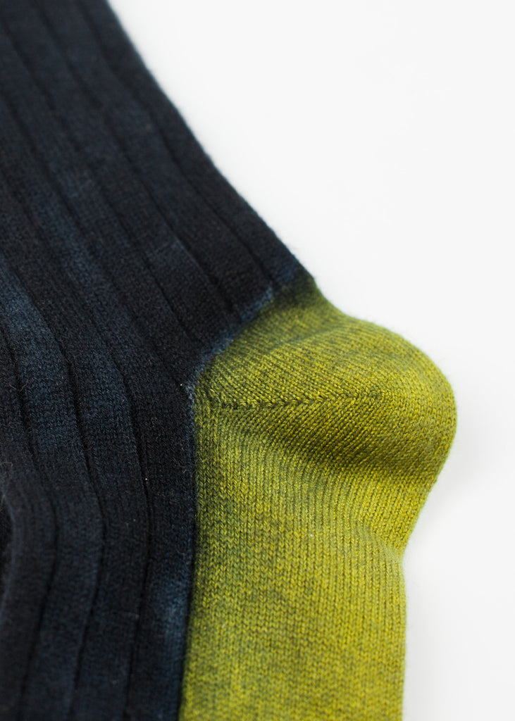 Color blocking rib knit cashmere socks. Lightweight and extremely indulgent with exposed seams at heel. Color Blue. 100% Cashmere. Made in Italy. One Size.